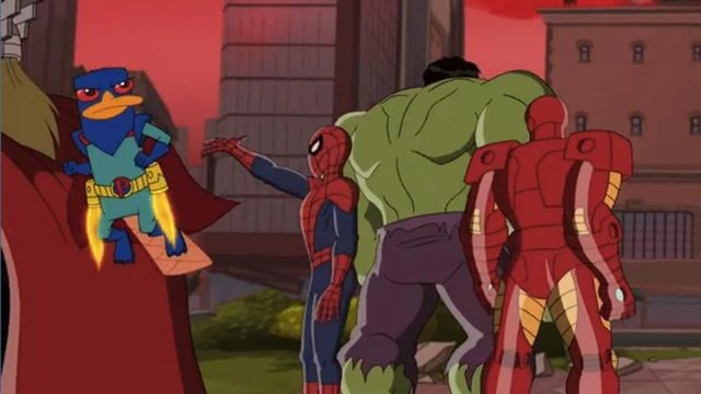 悪役は騒乱を引き起こす 騒乱を引き起こして悪役と間抜け ダンビル市役所では、レッド·スカルがホットドッグのデモンストレーションとしての第2のパワー·ドレイン·ネータースタンド破壊、トライステートの差し迫った終わりを宣言する。レッドスカルのスーパーヒーローダンヴィルの破壊を防ぐために戦うためにダウンタウンに来て厳しいことで結論としてフィニアス、ファーブ、そして英雄は、SHEDにテレビでこれを参照してください。無力であるにもかかわらず、英雄はトールがことを説明すると、とにかく戦うことに同意するものとし、「主人公であることがあなたが着る鎧が、あなたの決意であなたの精神と鋼中の金属ではありません。 " スパイダーマンは、速やかに皮肉と瞬間を台無しに。