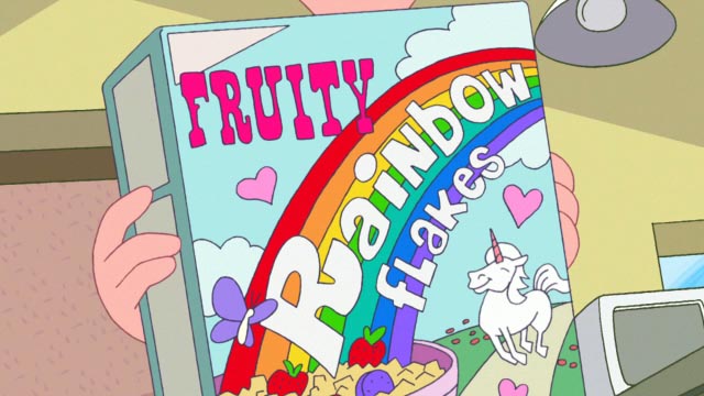 Over on Maple Street, Phineas and Ferb are about to fire up their rainbowinator. Phineas mentions Perry again, who still can't get into the entrance to his lair because of the cone around his neck. Ferb fires up the contraption and Isabella pours in some Fruity Rainbow Flakes cereal. The device launches its rainbow across the sky and distracts some fishermen in the harbor.