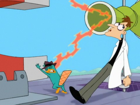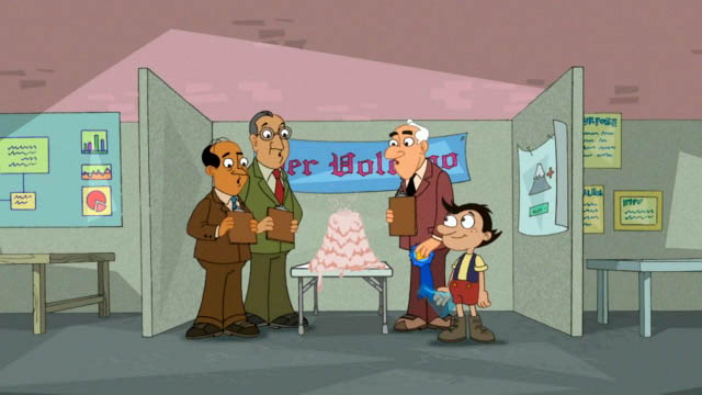 Then, Phineas and Ferb come in, pushing a cart with an object under a white cloth, Phineas saying "Greetings, Movers and Shakers". J.B. then asks aren't the boys a bit young to be Toy Designers. Phineas says he doesn't think so, and then shows them their toy: "Perry the Inaction Figure". They explain that because it can't do anything, it can do everything. J.B. says that they can promise the moon without really promising anything, and that he loves it. The man with the pointer then shouts about how this is a horrible idea and how it doesn't do anything, but he is cut off for J.B. activates a trap door that makes him fall (we hear a splash, then what may be some sort of roar, suggesting that employees/board members who disagree may lose their life in the process), causing another man who loves the idea even though he doesn't what it is take his place. J.B. then gives Phineas and Ferb the job, shows them to the factory (which they turn from dull to amazing) and begins to make millions from the toy.