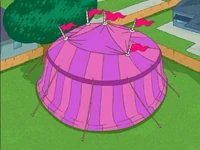 Họ dựng rạp xiếc riêng của mình. | Máy đổi giọng của Doofenshmirtz bơm khí Doofelium vào rạp cho đến khi bị hất văng. Fern sau đó nhấn nút để hạ ghế khán giả về dưới mặt đất. | Hai anh em dựng căn lều to ở sân sau, sau khi nghe được tin buổi diễn xiếc ở địa phương bị hủy. |