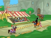 Họ tổ chức buổi đấu ngựa tại Anh. | Con rồng máy khổng lồ được Doofenshmirtz điều khiển rơi xuống võ đài và làm nổ tung mọi thứ. | Candace ban đầu vào vai một thiếu nữ khốn khổ, nhưng rơi vào tình thế khốn khổ hơn trong vai Black Knight |