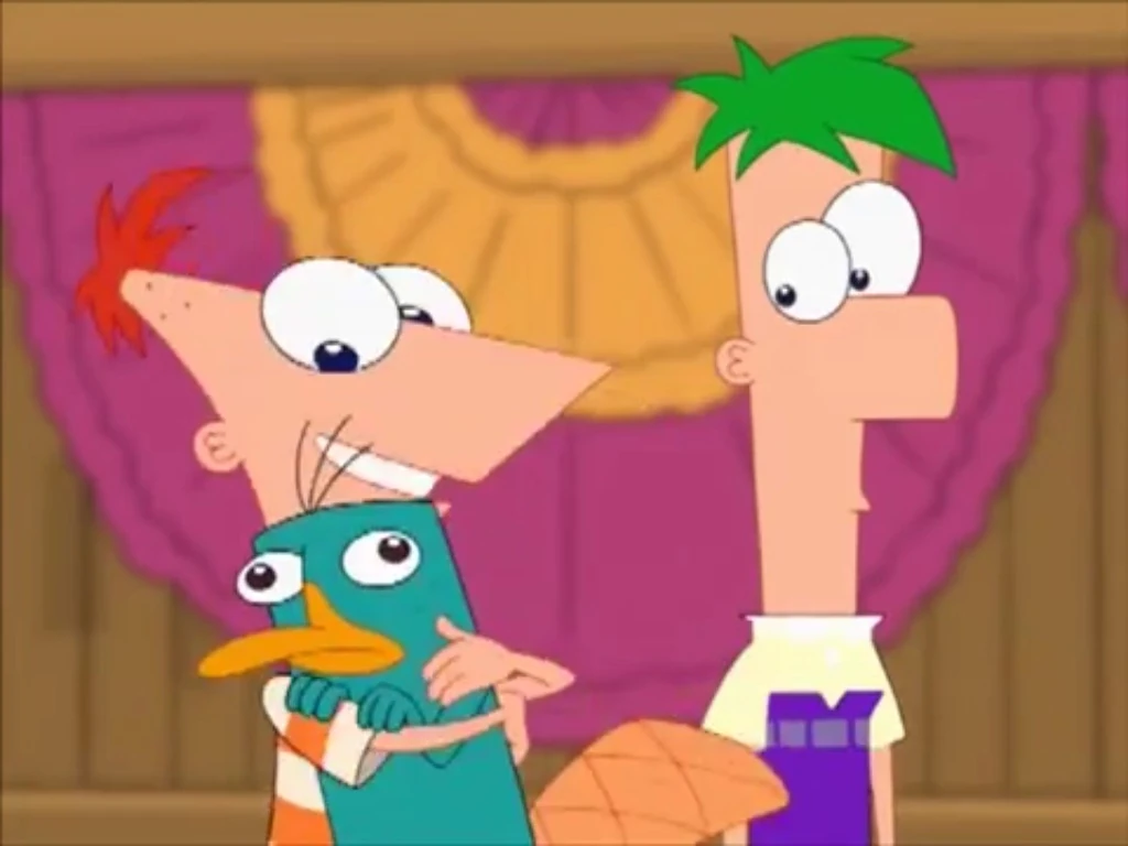 - Khi Phineas ôm Perry, những cái sọc ngang trên áo của Ferb biến mất một lúc.