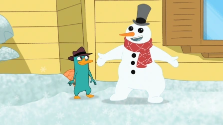 Người tuyết: Xin chào! Mùa đông vui thật đấy! Theo tôi nào! Đi nào, theo tôi!(bước đi) Người tuyết vừa đi về phía trước vừa vẫy tay. Ngay sau đó gã này kêu lên một tiếng rõ to "Xe ủi!" và một củ cà rốt lăn về phía Perry. Cảnh quay mở rộng ra giữa con đường và cho thấy một chiếc xe chở hoa quả bị tông đổ, hoa quả bắn tứ tung. |
