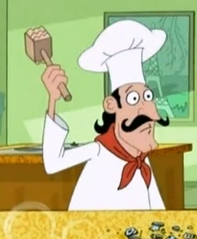 He wears a chef outfit, a red scarf, with black hair and a big mustache.