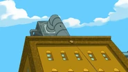 Ferb presses a button to raise the drawbridge when the bowling ball approaches.