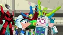 Phineas, Ferb, and Clive Addison working together with special effects.