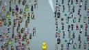 Ducky Momo prepares to take off the mask to reveal the person inside the Ducky Momo costume.