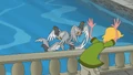 The kids fly over Linda and Lawrence.
