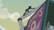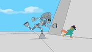 Doofenshmirtz is running on the roof to get away from Lyla and Perry.