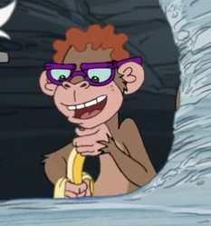 He is a monkey that has reddish-brown curly hair and wears purple framed glasses. He also has dark green eyes and freckles.