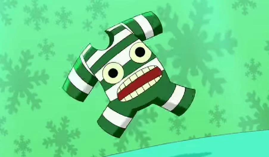 He looks like a vintage bathing suit with green and white stripes. The sleeves and legs of the garment act as his limbs. He has two round eyes located on the chest of the swimsuit, and below that a big mouth with blocky teeth. He is also made of wool ("The Ballad of Klimpaloon").
