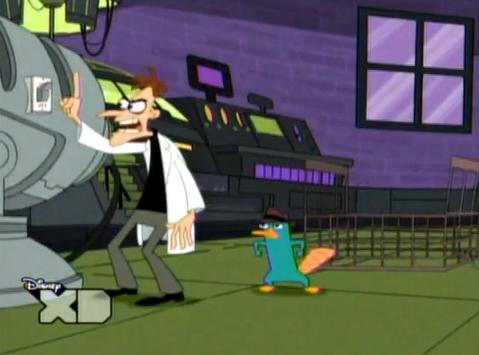 Doofenshmirtz uses the Platy-Proliferator-inator to create Perry clones, then uses them to frame the original Perry for crimes including kicking over a trash can, robbing a truck trailer full of money, speeding while throwing the stolen money at the cops, and eating cereal (which Major Monogram explains isn't really a crime). | Perry hits the reverse button, sucking all the other Perry clones and Doof back into the machine. Doof clogs the device, causing it to explode. |