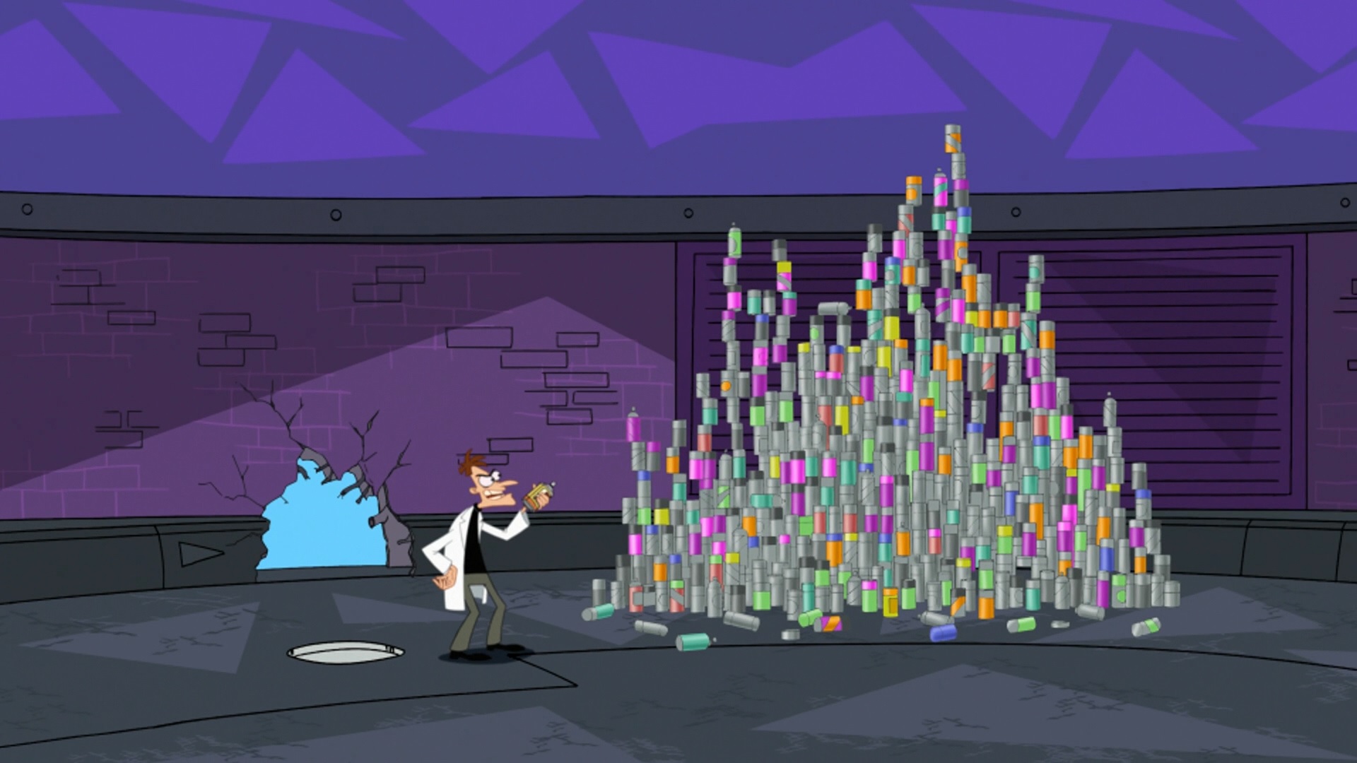 Doofenshmirtz builds the Junk Food-inator in order to make all healthy food unhealthy by covering it in high-fructose corn syrup and hydrogenated coconut oil, thus rendering the citizens of Danville easy to control once he's the only person left eating healthy food. | The giant ice scorpion from Phineas and Ferb's ice wedding tower crashes into the inator and knocks it away. Meanwhile, Doofenshmirtz has made himself sick snacking on vegetables dipped in the Junk Food-inator's vats, using it against himself without realizing it, and he excuses himself to the bathroom. |