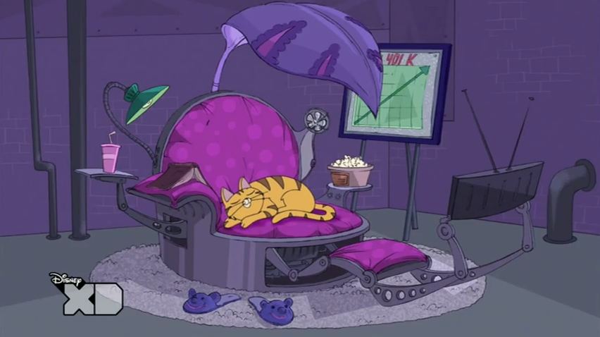 Doofenshmirtz visits the Regurgitator after being downgraded to a low threat, accepts an internship with him, and invents unnamed rocket boots so the Regurgitator can reach some high up files and a self-destruction system for the lair. | The Self-Destruct Button destroys the entire base. Perry later uses the Rocket Boots to transport himself and Doofenshmirtz out of the exploding lair. |
