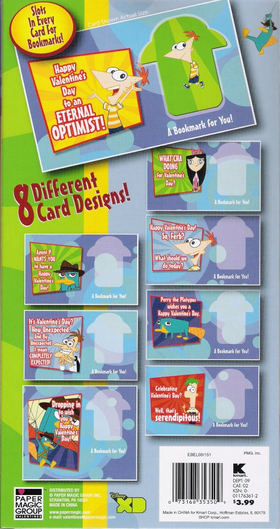 Phineas and Ferb Valentines are manufactured by the Paper Magic Group and are available in most retailers. The package contains 24 valentines and a sheet of heart stickers to seal them with. The cards come in 8 different designs. Many use the characters' (featured on the valentines) catch phrases, only altered for Valentine's Day.
