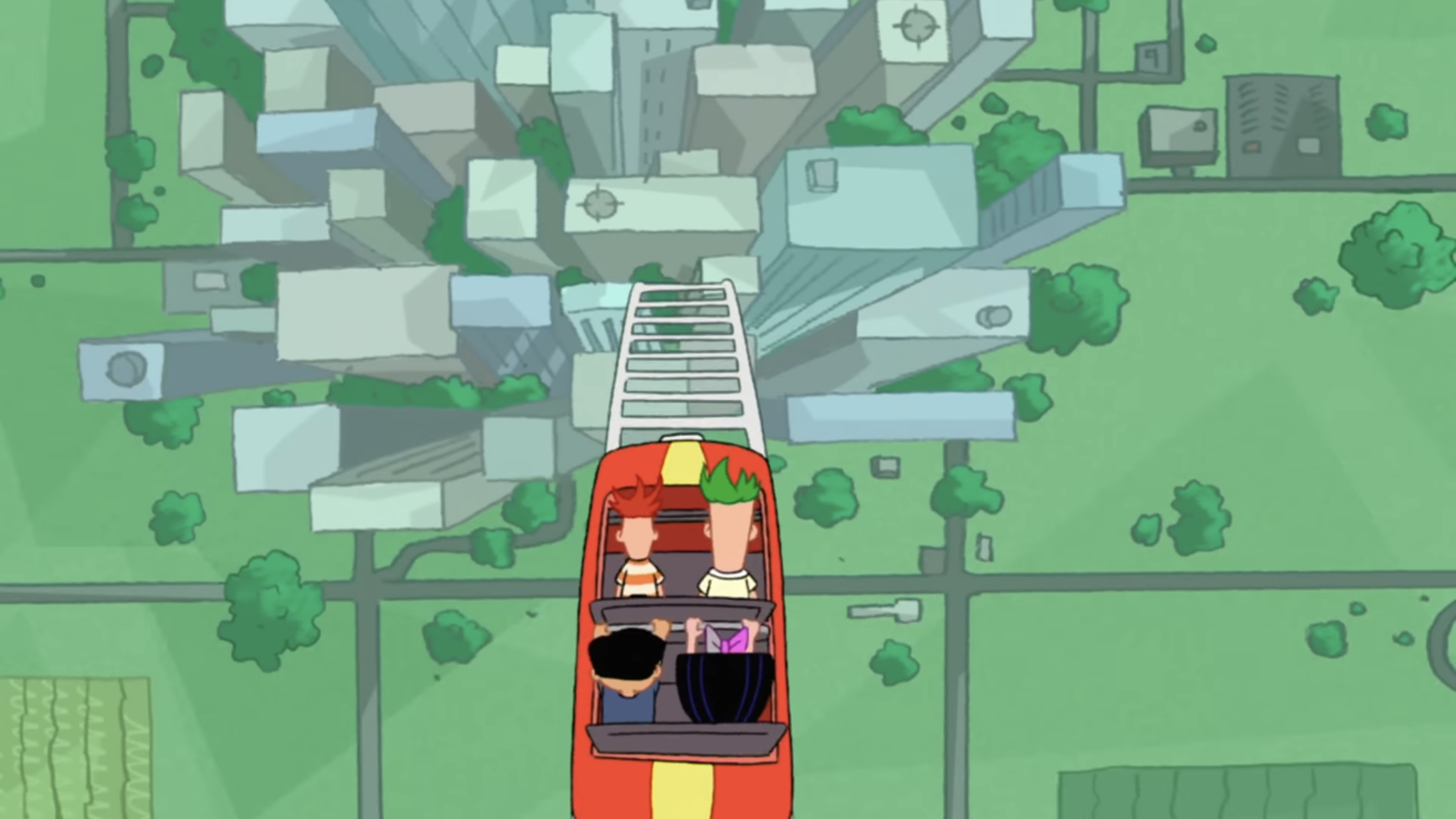 Phineas and Ferb unveil the Coolest Coaster Ever to the neighborhood kids. The first lift hill climbs up through the clouds, high enough that a bird flies into the track and falls to the ground. As they start to go up, Phineas is showing everybody how the seat belts work, but he drops it. The coaster comes to a stop at the top of the lift hill, revealing part of downtown Danville far below them, then shoots down to begin the ride. There are loops, hairpin turns, and the promised corkscrew. A load of rubber snakes falls on them just before they plunge into a mud bucket. Fortunately, the next section includes a trip through a car wash and they all emerge squeaky clean. Next is an "A-A-A-A" portion and a few loops around Doofenshmirtz Evil Incorporated.