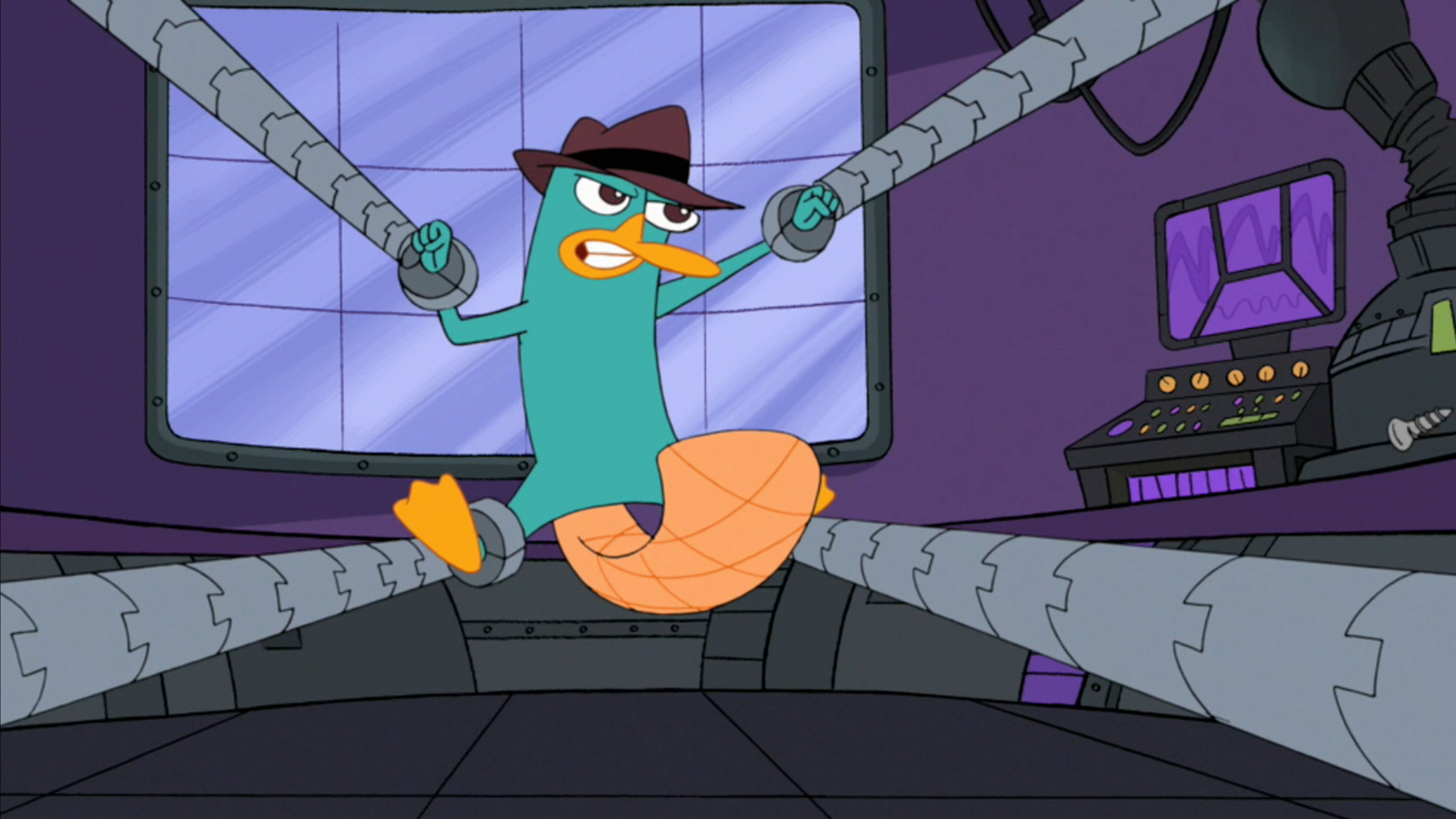 Nearby, Agent P swings in through a window at Doofenshmirtz Evil Incorporated and confronts Dr. Heinz Doofenshmirtz, who traps him in robot arms and talks about his plan to move the Eastern Seaboard (now covered in tinfoil) to the West by using a "Magnetism Magnifier", which will reverse the rotation of the Earth. While Doofenshmirtz is talking, Agent P tries getting free, but then notices a screw on the ground at his feet. Looking around him, he formulates a plan.