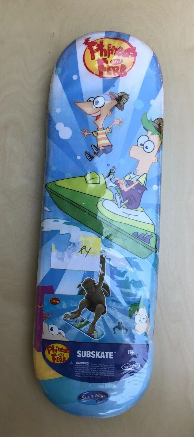 Phineas and Ferb Subskate | Pool subskate decorated with a beam and wave backdrop and art of Phineas and Ferb riding a motorboat in explorer gear. | ||