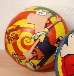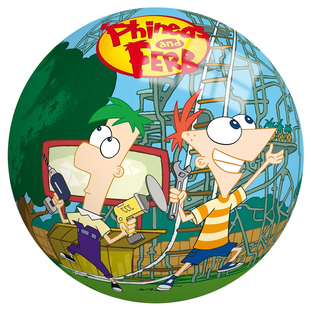 Phineas and Ferb Ball | Regular ball embellished with a stock piece of Phineas and Ferb joyfully presenting the awesome backyard rollercoaster. | ||