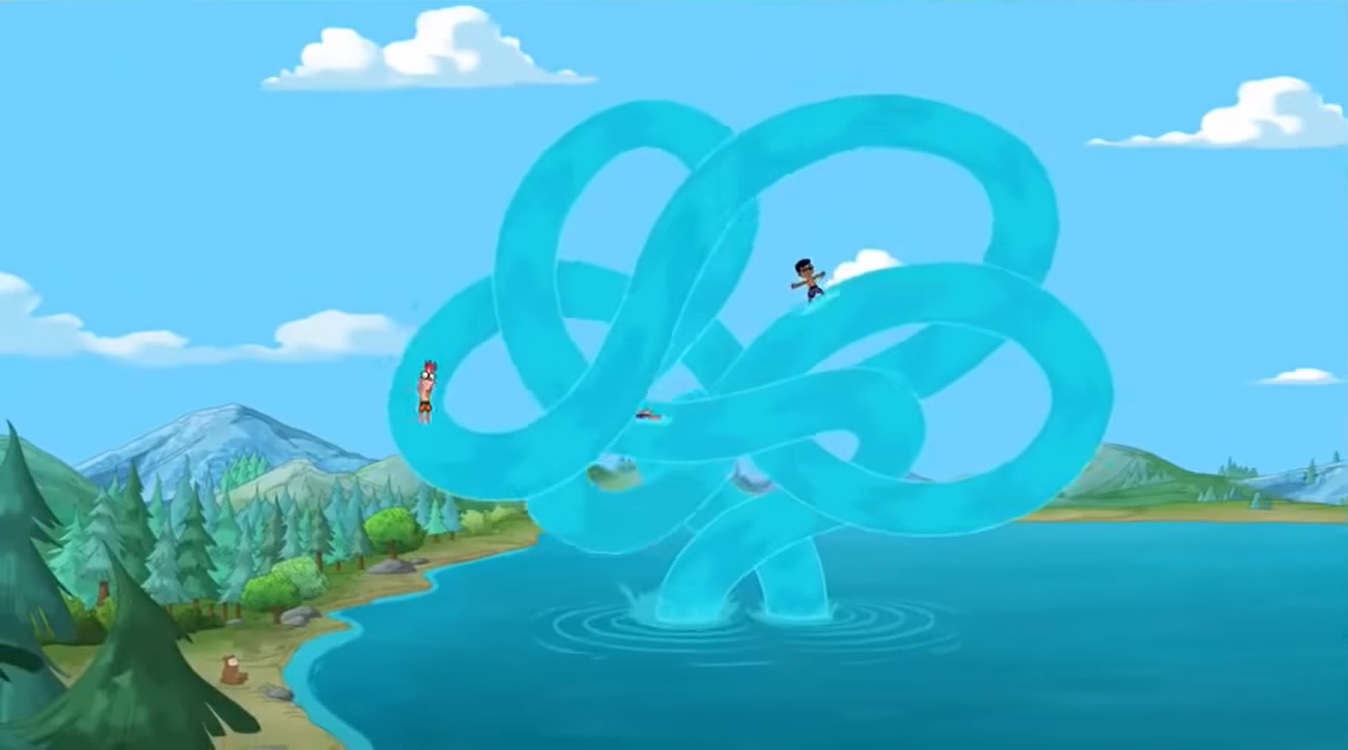 Buford eventually stumbles upon the kids' sprinkler slide in the lake. Desperate, he swims towards it, and is carried upwards by the current. While the others continue to have fun, Buford is caught at the end by his former love interest. Suddenly, the fountain is straightened by an outside interference, causing everyone to fall to the bottom ("Buford Confidential").
